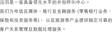 迅羽擁有豐富的客服中心建設(shè)及管理實(shí)務(wù)經(jīng)驗(yàn),熟悉各行業(yè)的運(yùn)營情況,為客戶提供一站式的電話數(shù)據(jù)處理解決方案。
